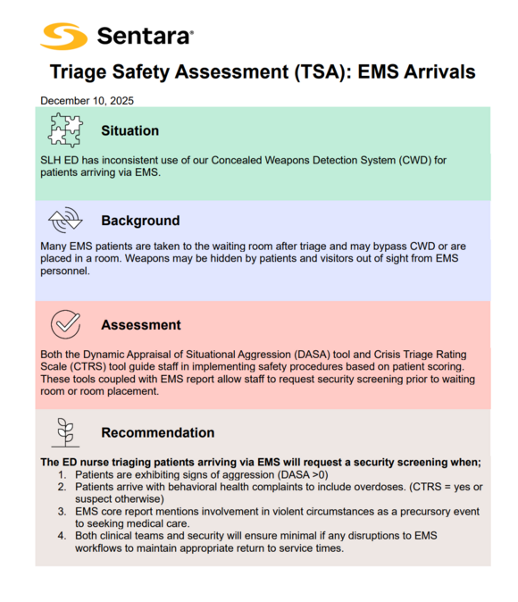 Team members brought concerns forward highlighting vulnerabilities in our EMS arrival process specific to CWD utilization. As a result, effective 12/10/25, security will perform safety screenings based on our Triage Safety Assessment (TSA). The TSA process simply uses DASA, CTRS, and EMS communication to cue a screening prior to patients being placed within the department. Please review the following documents for more detailed explanations.