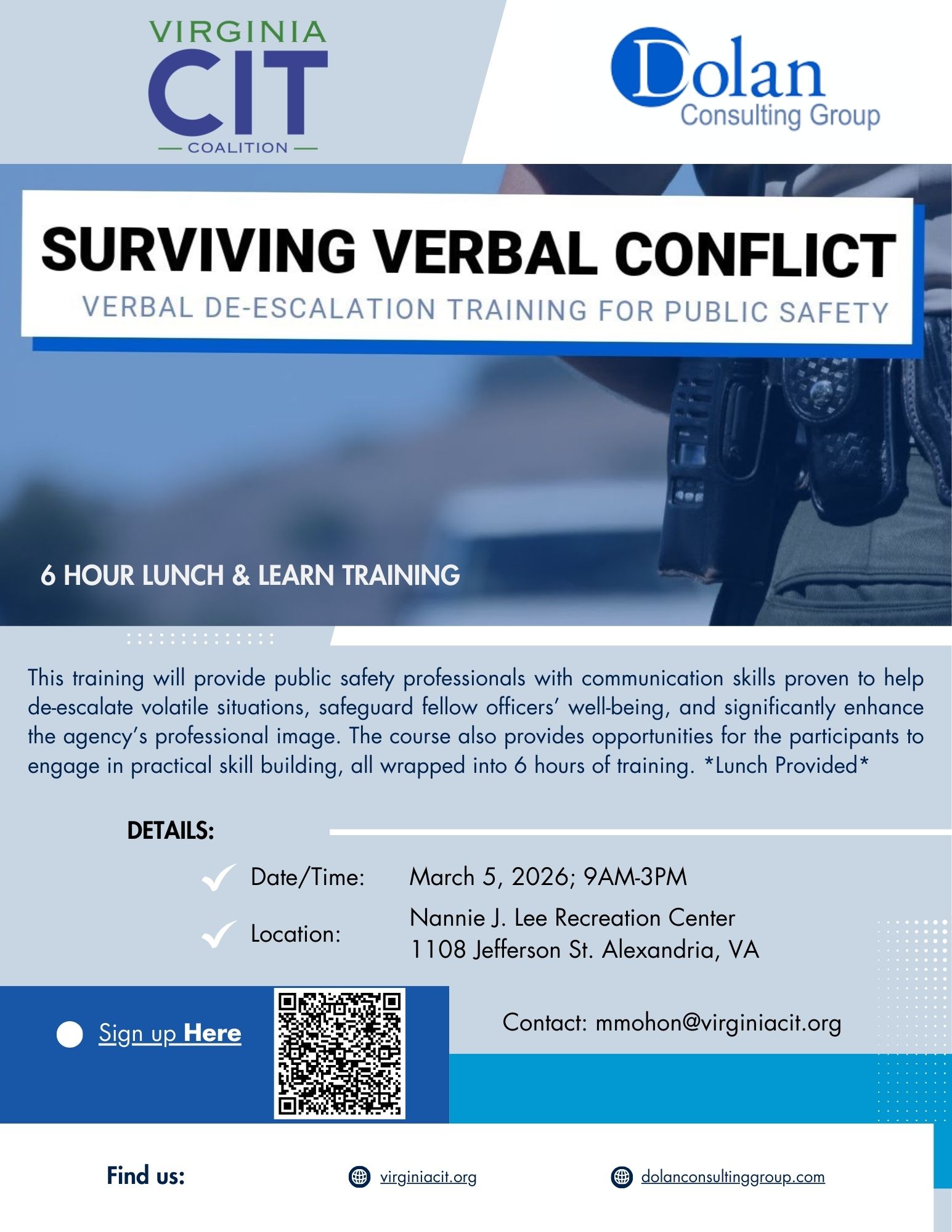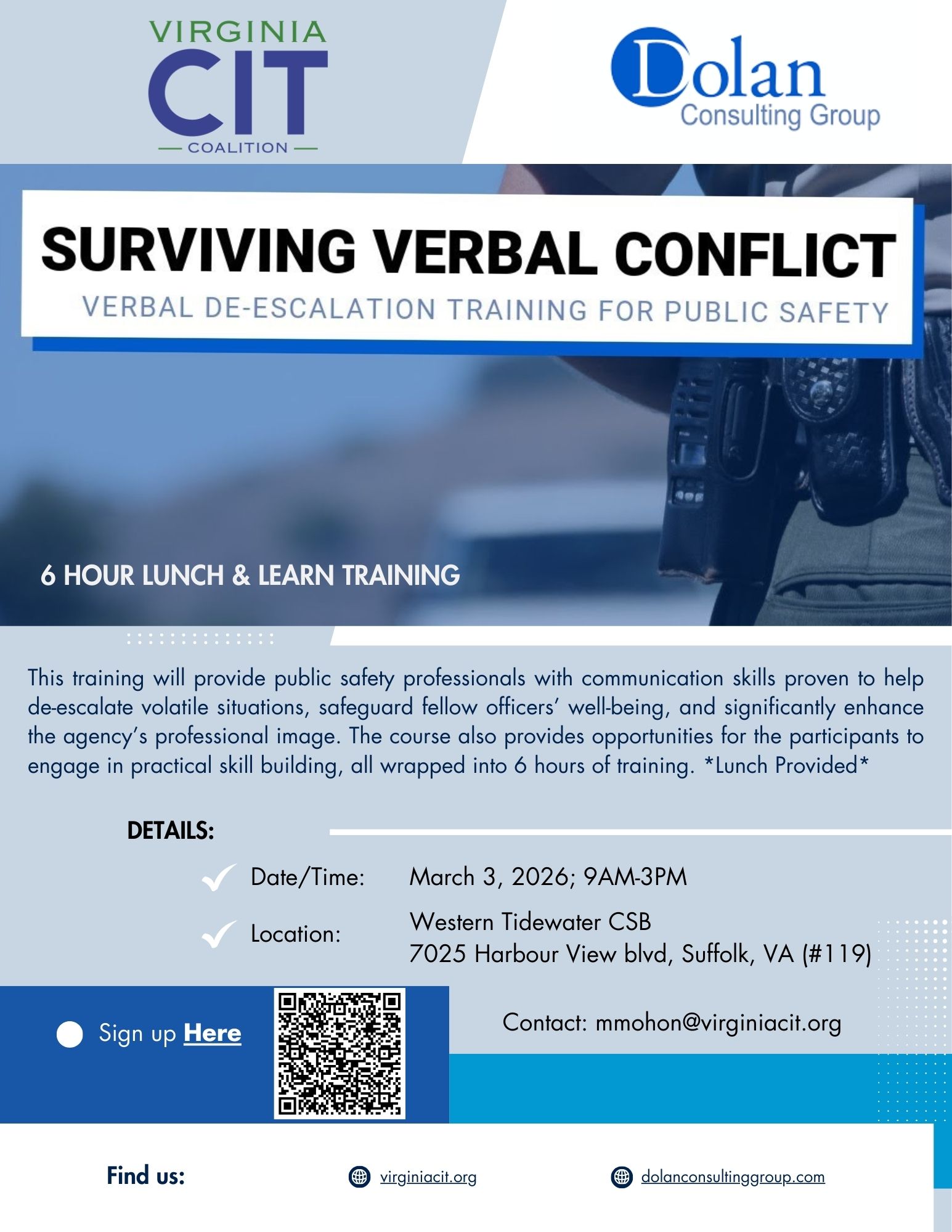 I'm going to apologize in advance for all the emails you're going to be receiving from me, but this is another fun one. I have attached the fliers for all of the Dolan Group Advanced De-Escalation Trainings being hosted by VACIT across the State in the month of March. Please be aware of the locations on each of the fliers as there are different locations and sign-ups for each. Otherwise, feel free to distribute as you see fit.